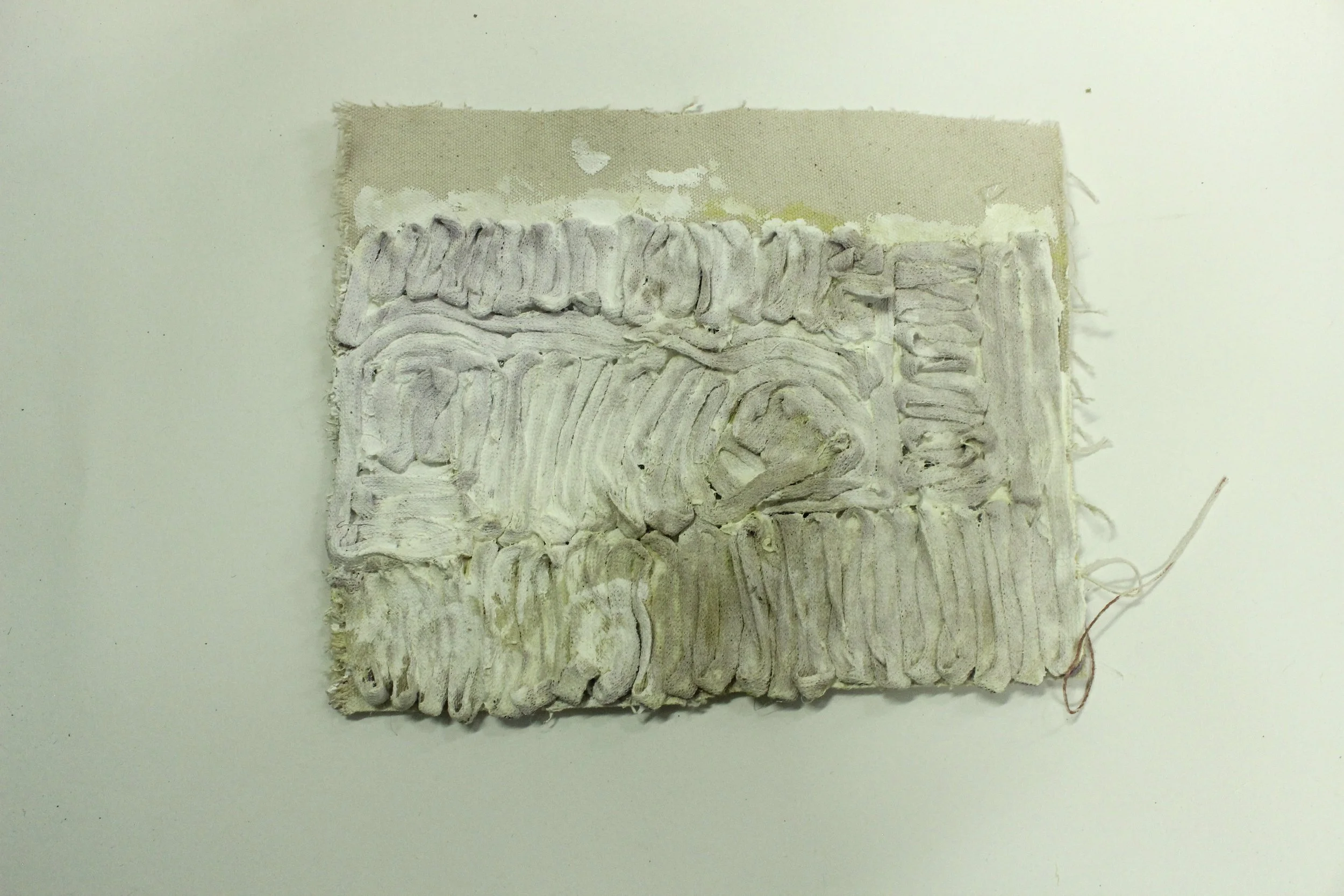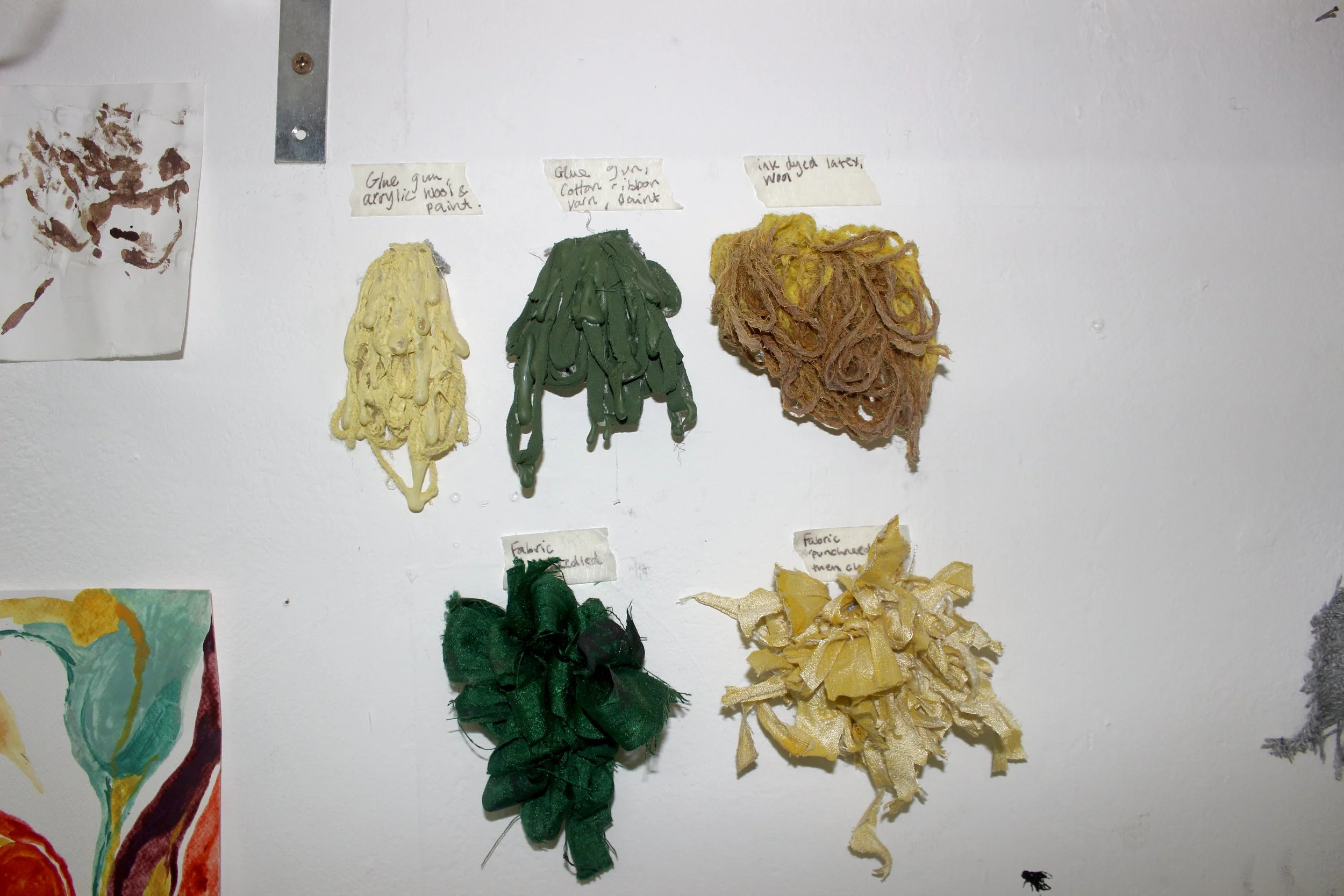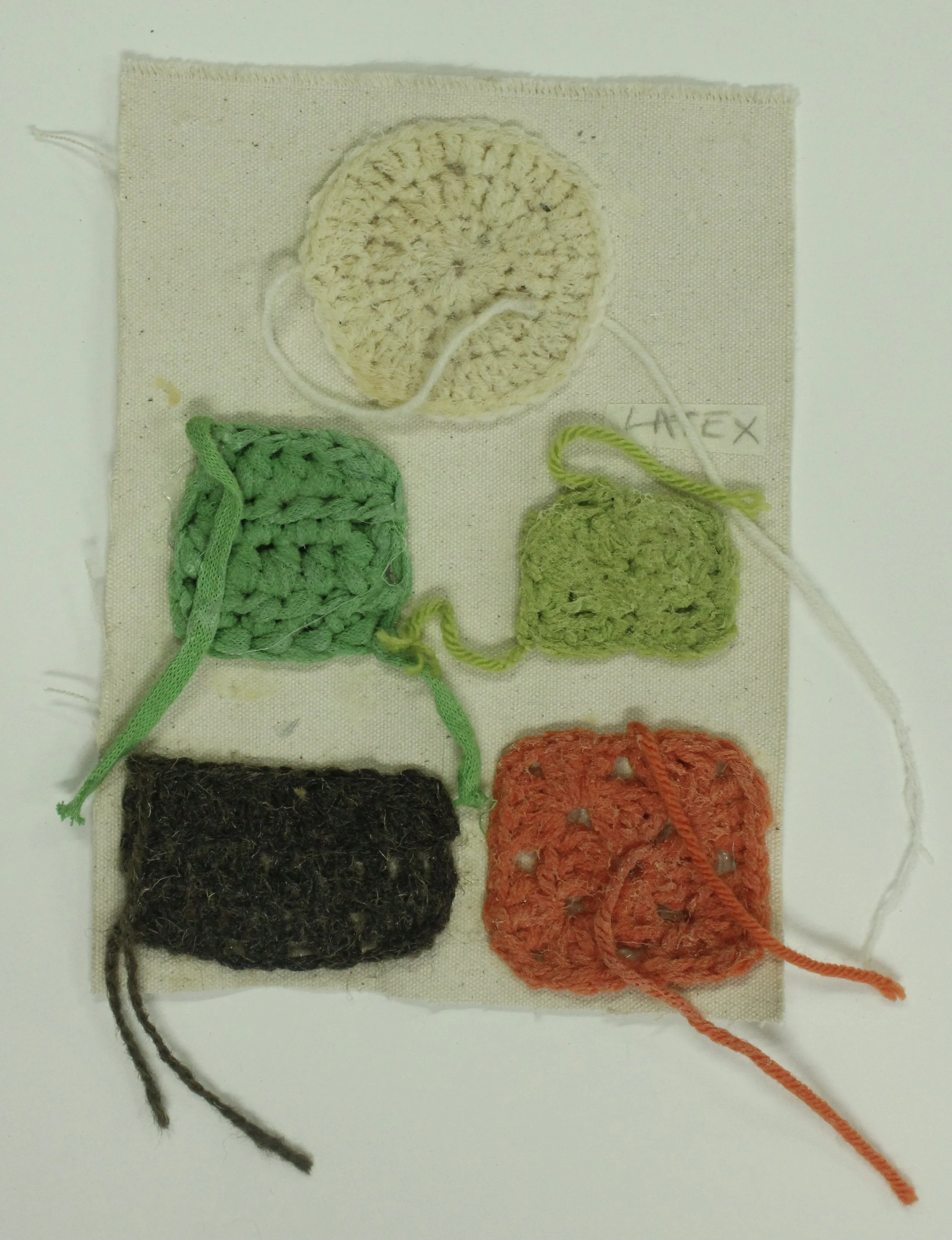 These select experiments, which are a form of sketch for me, investigate how best to replicate texture, colours and the ‘tangibility’ of mould and decay by using fabrics, fibres, latex, varnish, wool, dye, paint, glue, crochet and hand tufting for a Euphony of Haptic Decay (2023). Works from the selected textile works series also contribute to the testing and trialling.