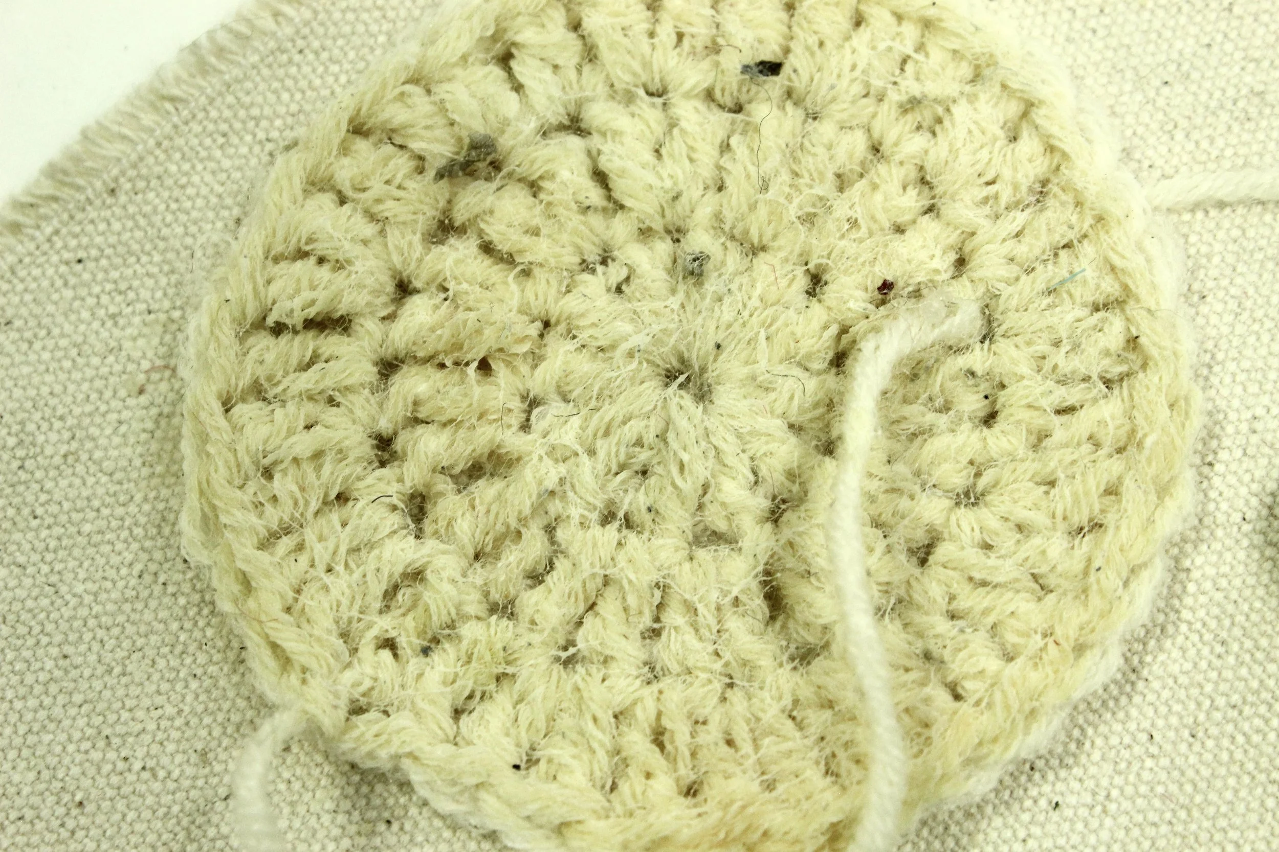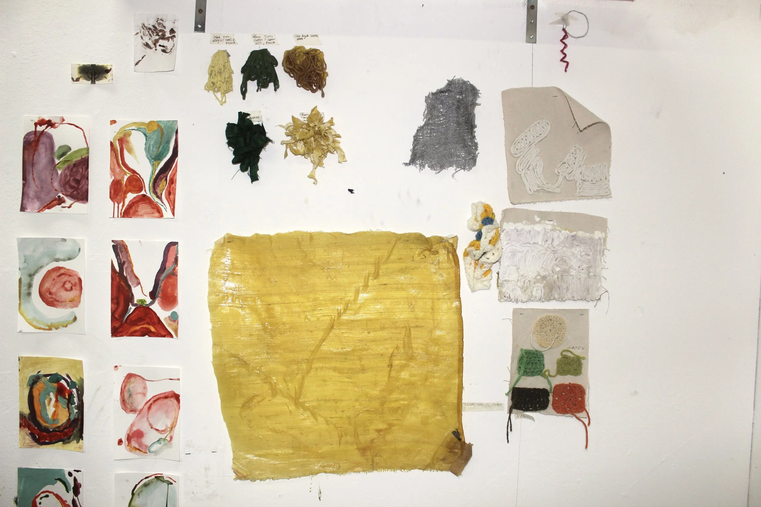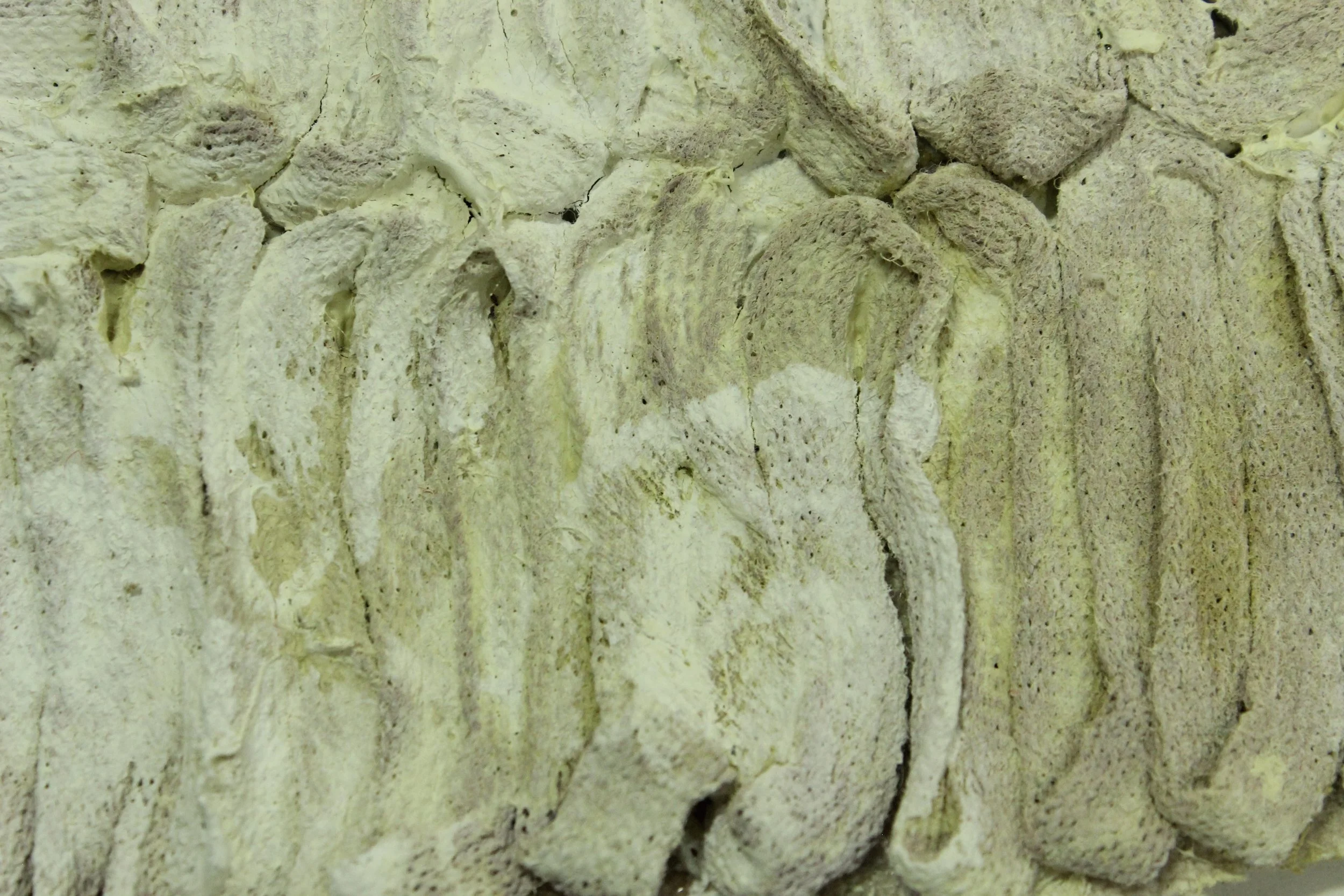 These select experiments, which are a form of sketch for me, investigate how best to replicate texture, colours and the ‘tangibility’ of mould and decay by using fabrics, fibres, latex, varnish, wool, dye, paint, glue, crochet and hand tufting for a Euphony of Haptic Decay (2023). Works from the selected textile works series also contribute to the testing and trialling.