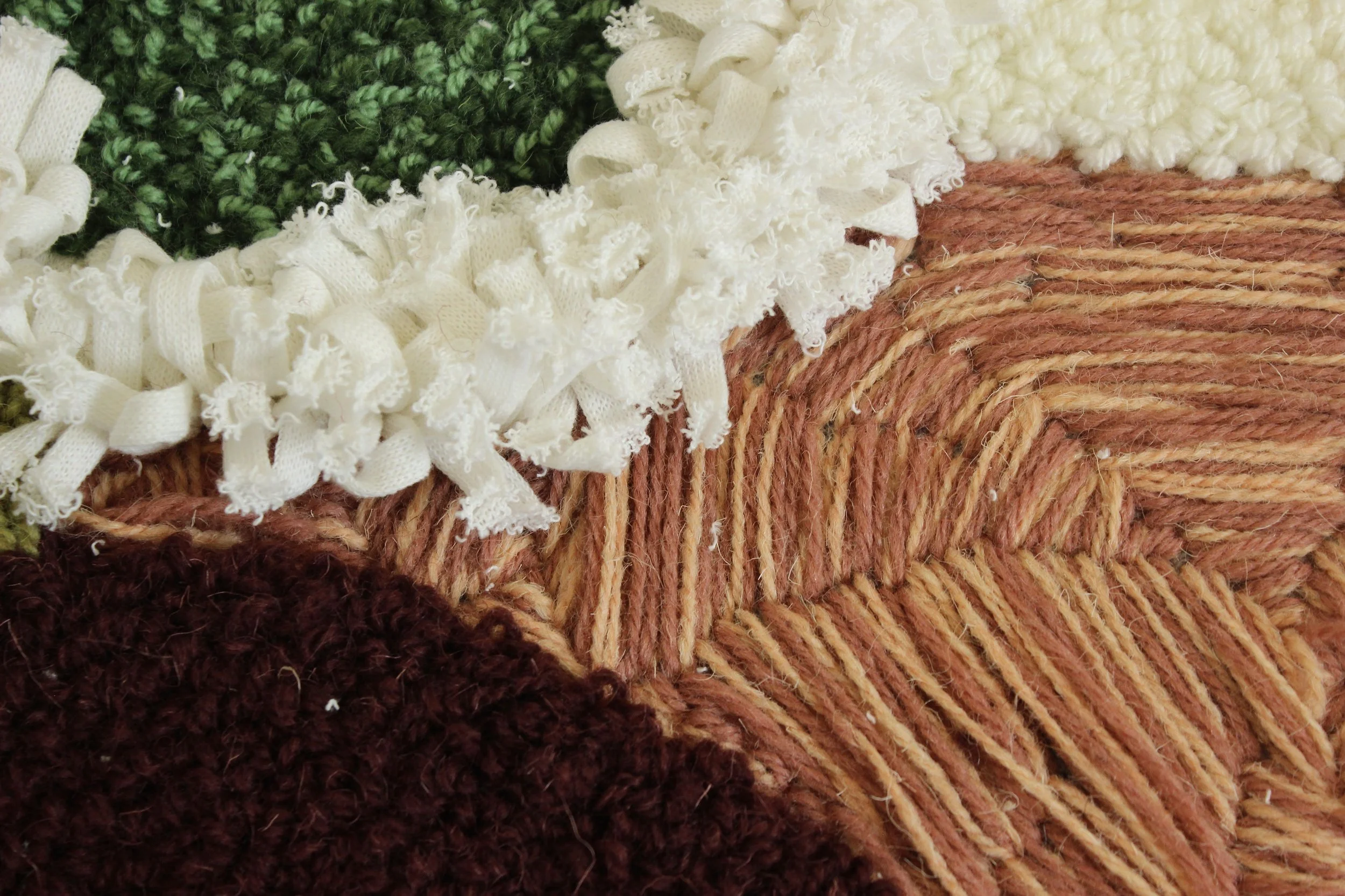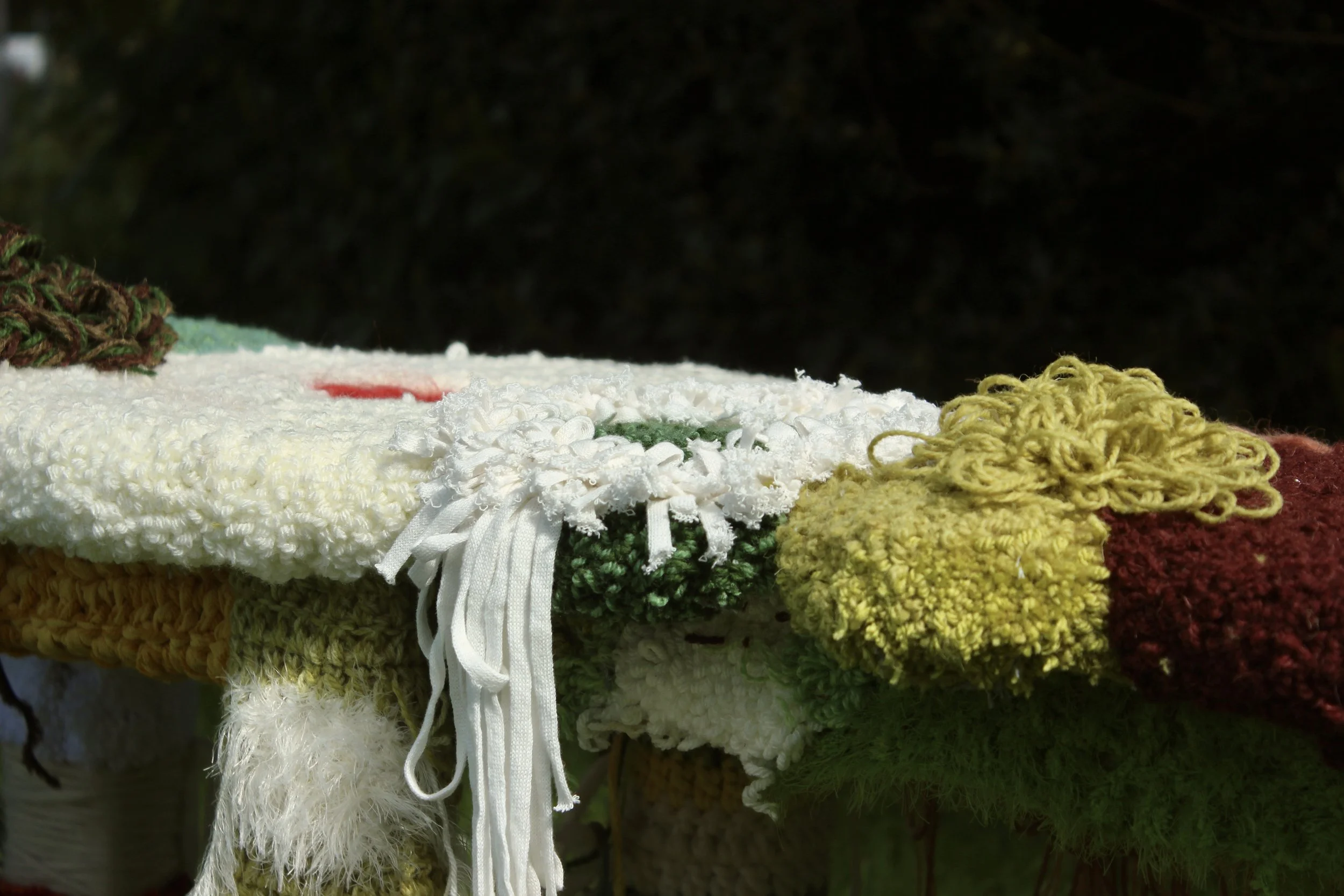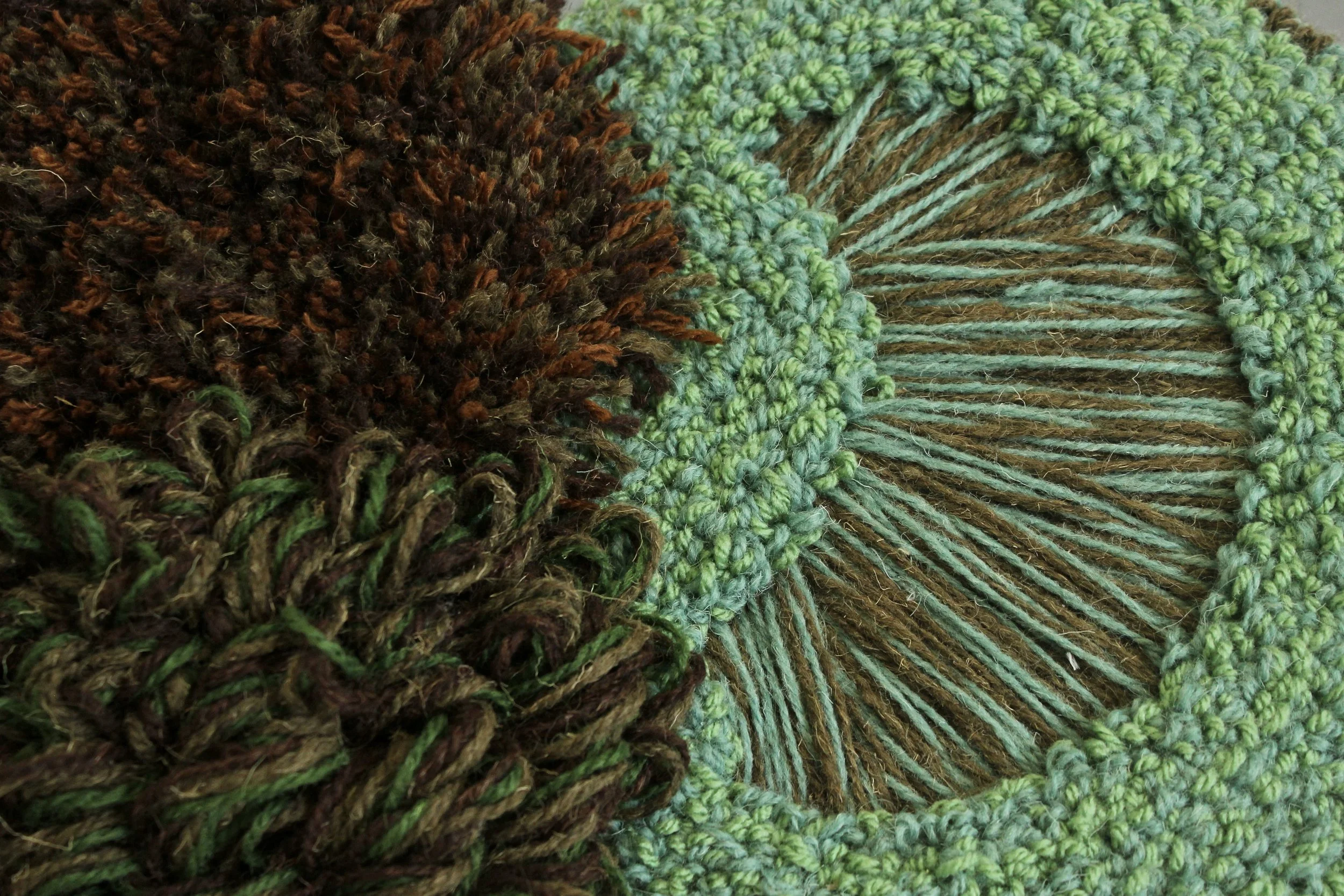 Hand tufted and crocheted.