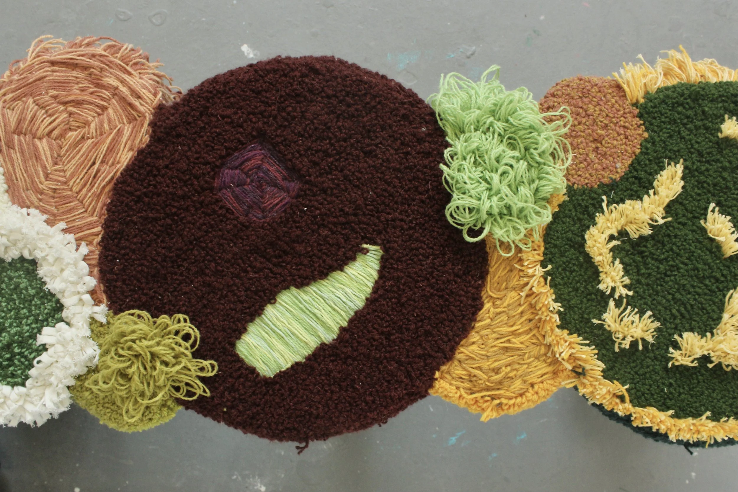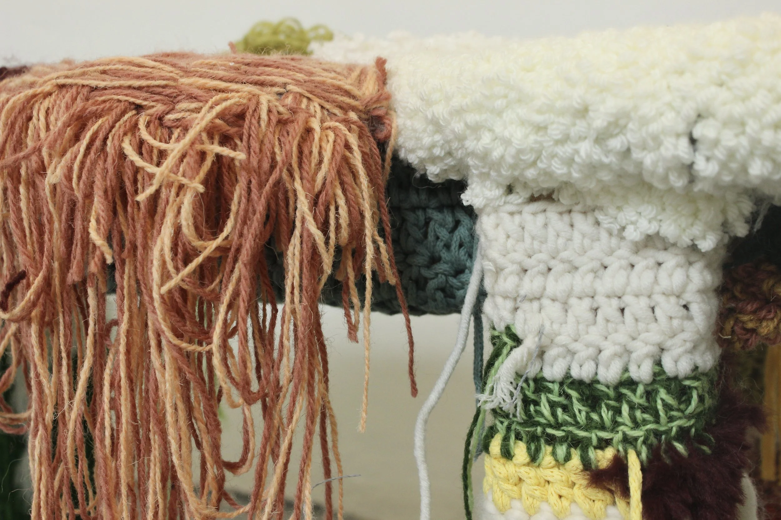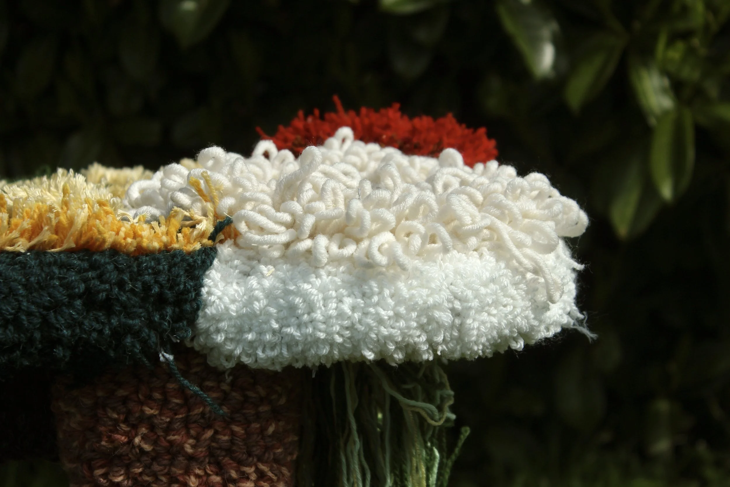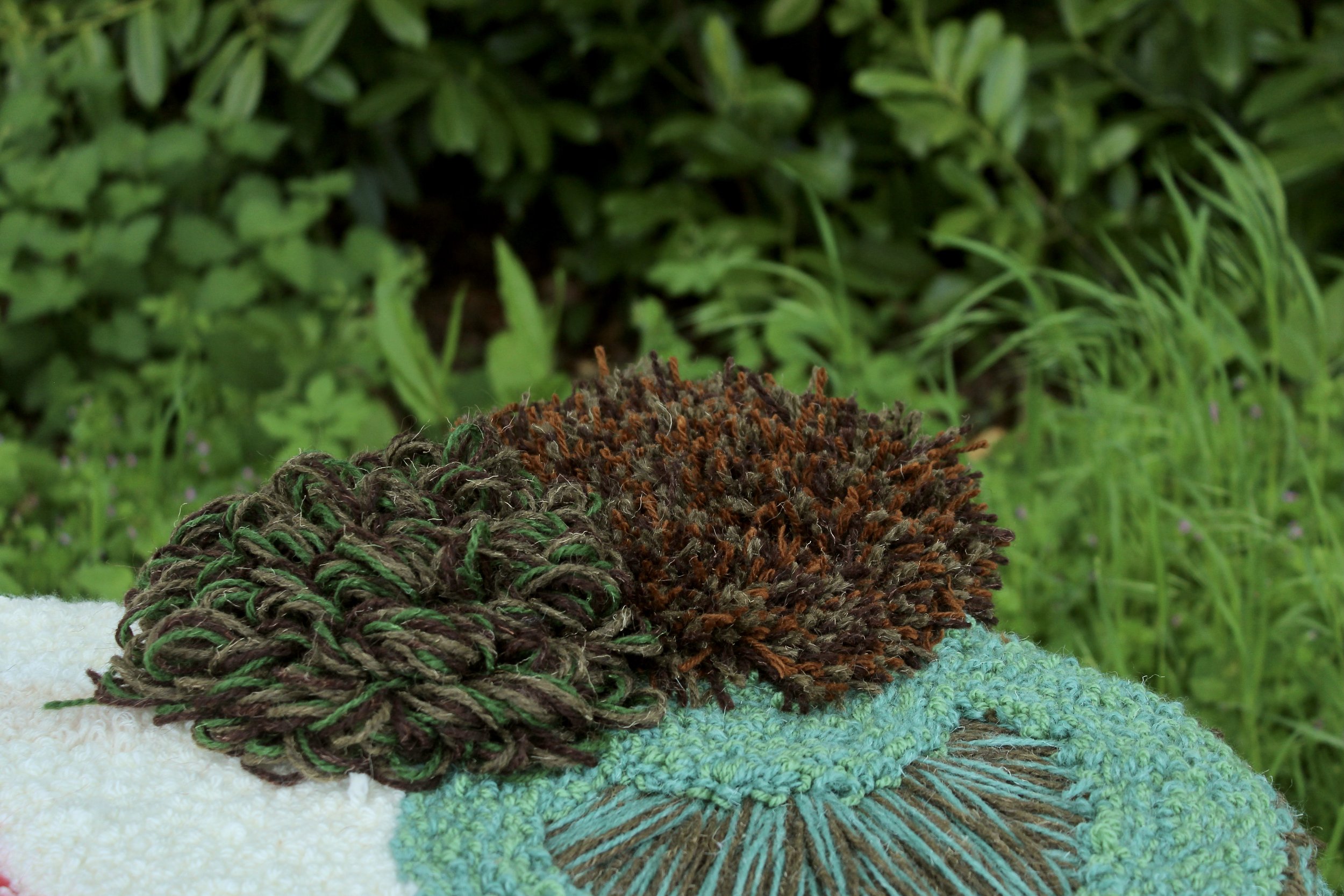 Hand tufted and crocheted.