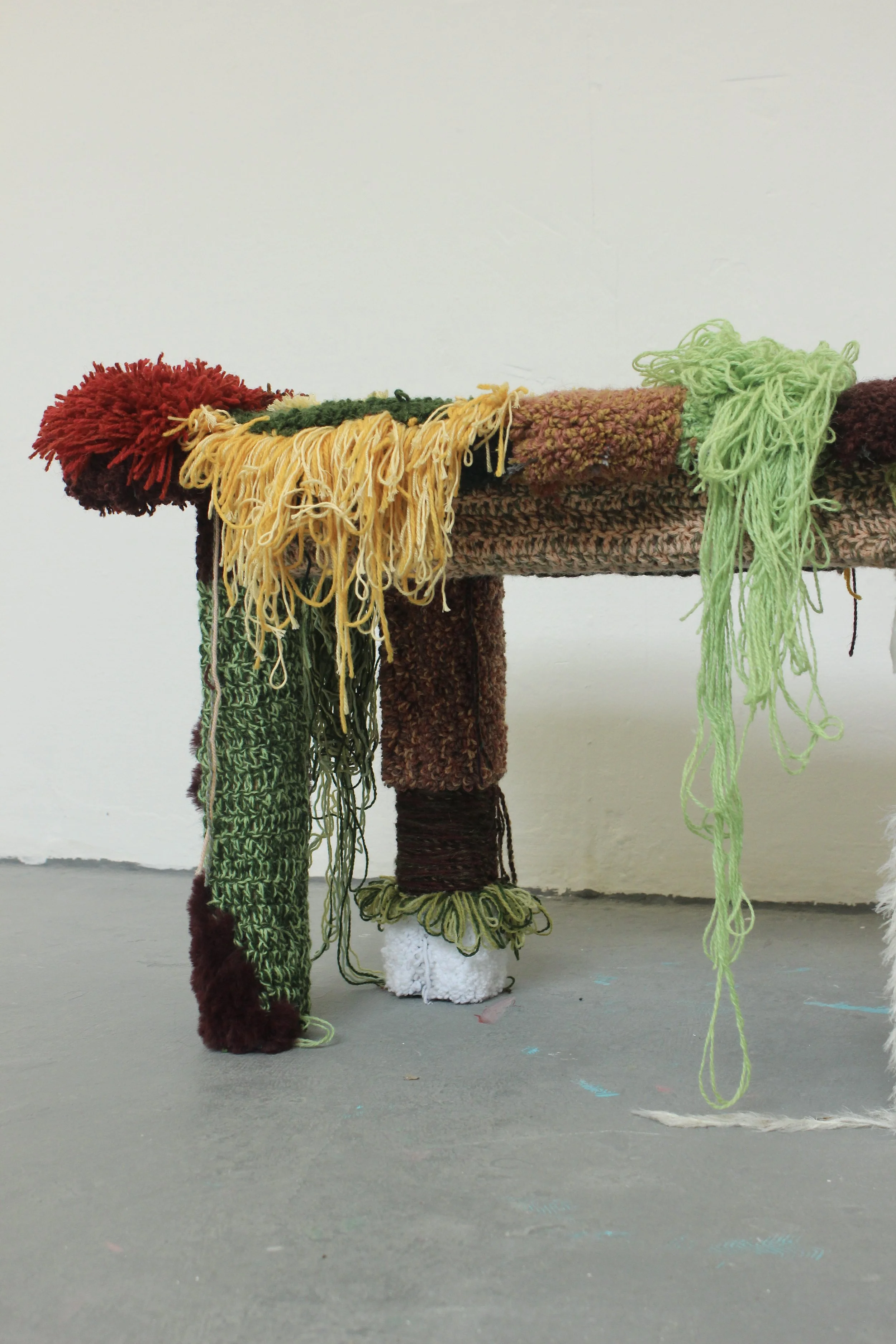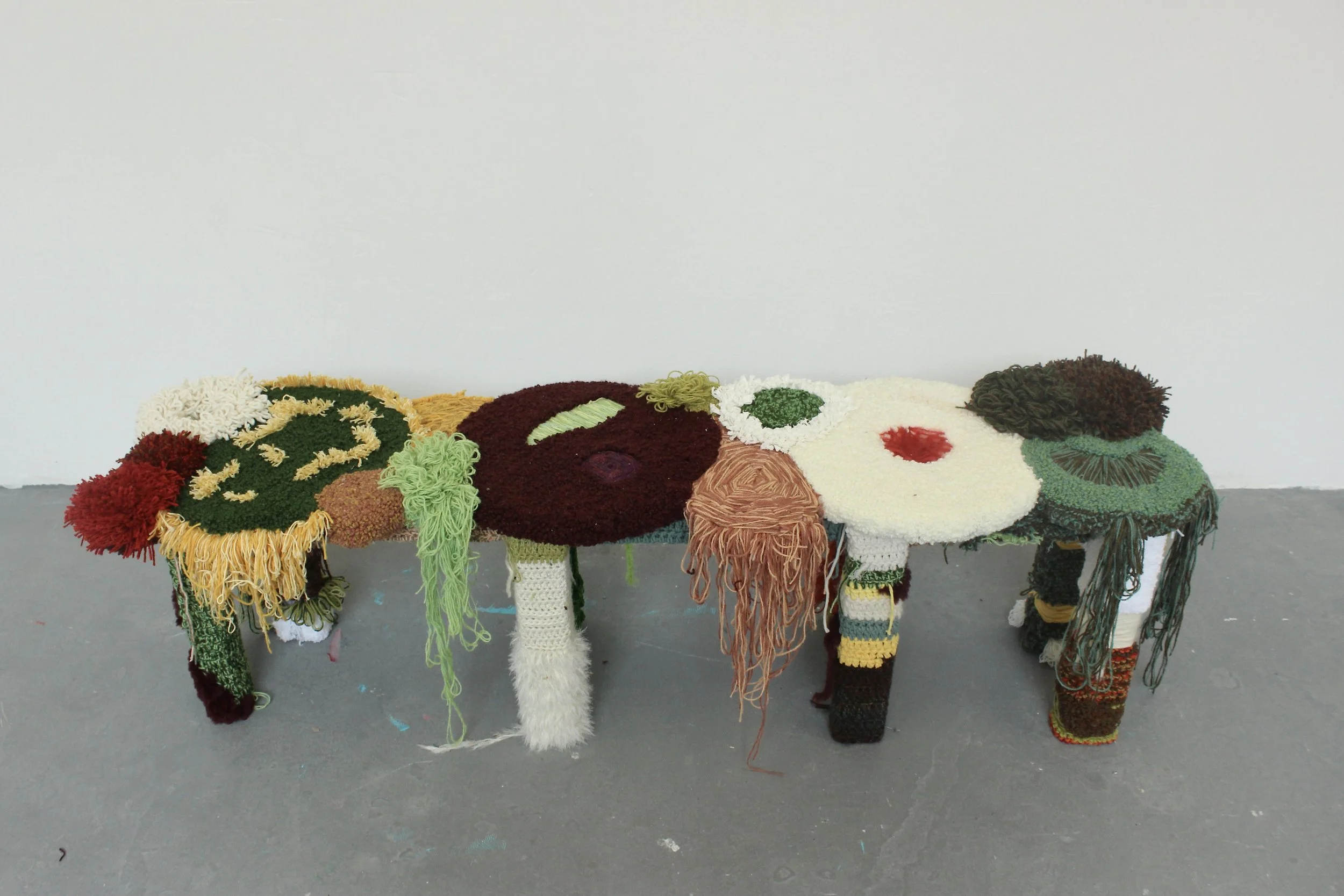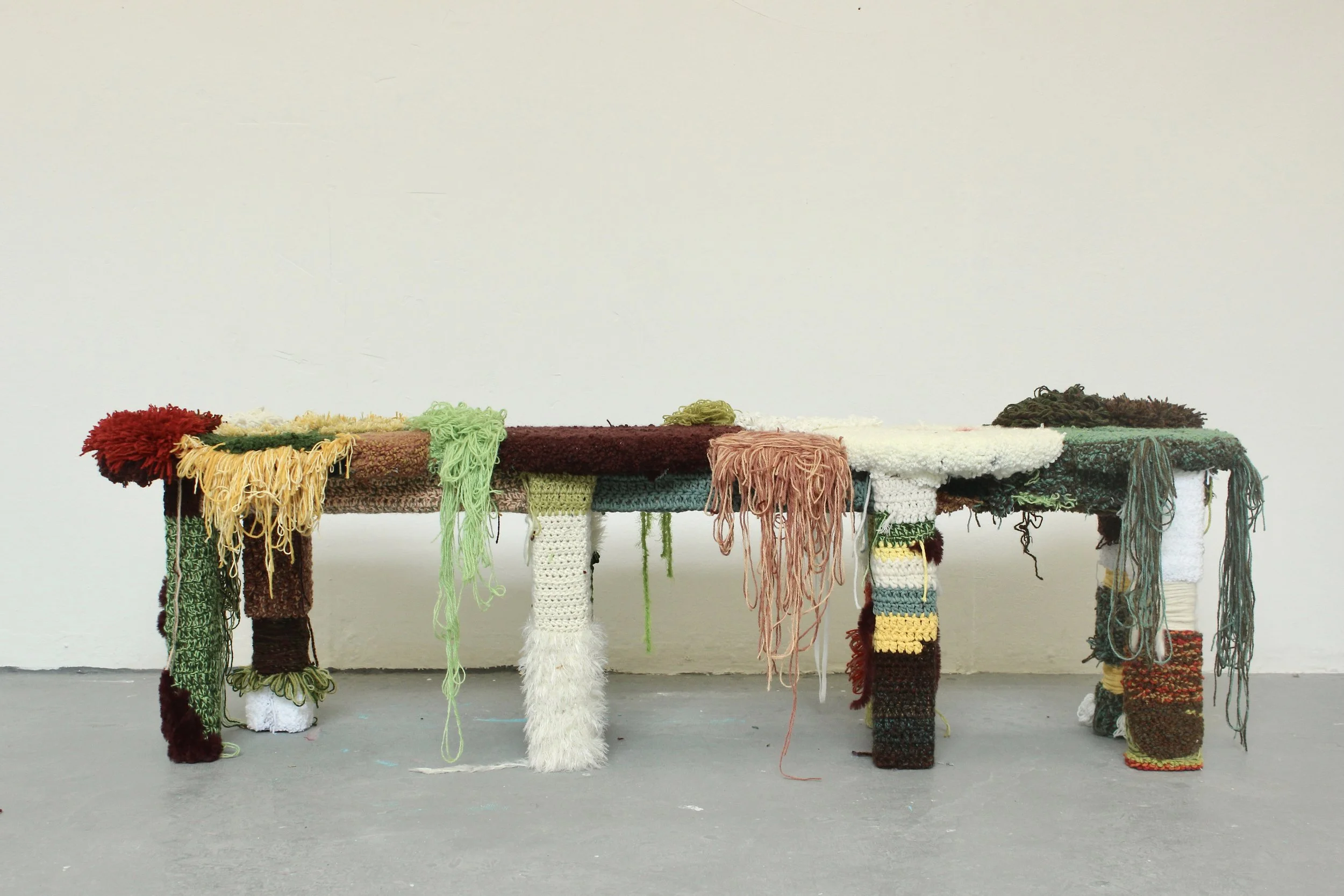 Cotton, lambs wool, acrylic, pinewood, MDF.